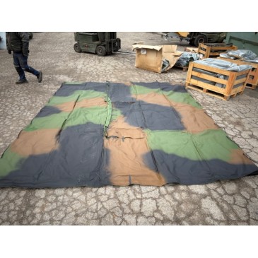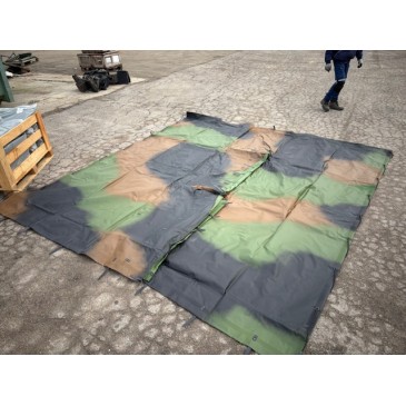 BACHE COULEUR CAMOUFLAGE QUALITE ARMEE ATTENTION IL Y A DES OUVERTURES DE CHAQUE COTE . DIMENSIONS 3.5X3.8 M